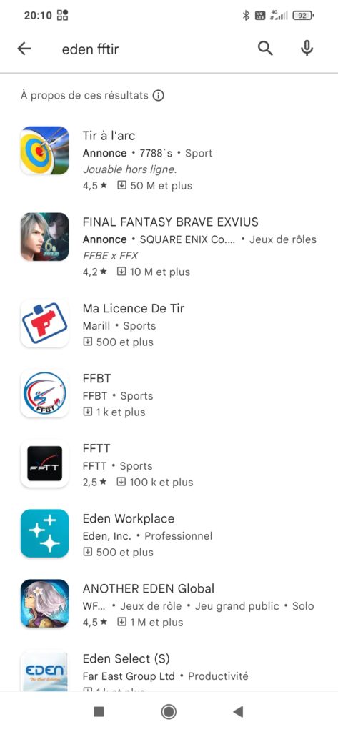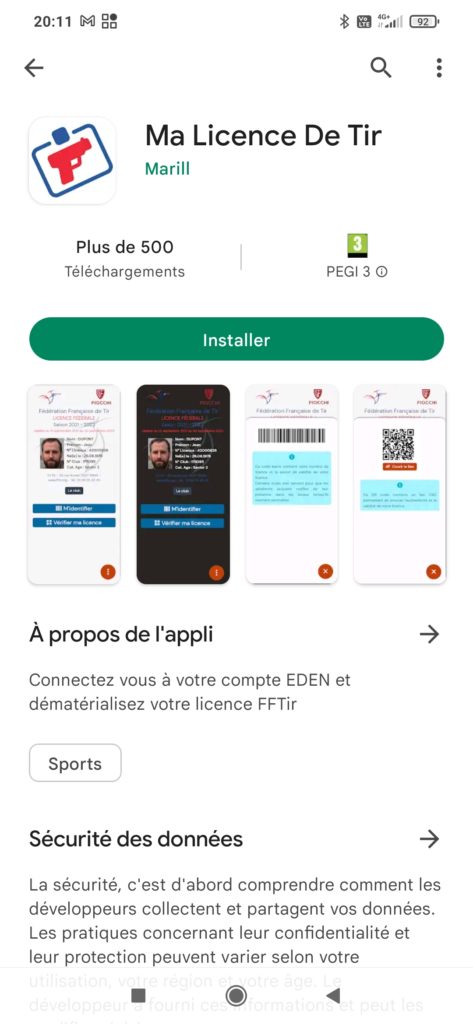 Tout d’abord, il faut ouvrir l’application « Play Store » et taper « Eden fftir » dans la barre de recherche. Sélectionner « Ma licence de tir ».